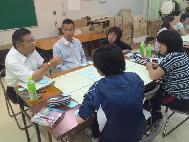 7月23日(木)から夏休みに入りました。児童のいない学校では、2学期に向けての準備や会議、教師としての力量を高めるための研修を実施しています。23日(木)はワークショップ形式で1学期の研究の振り返りを行いました。それぞれの班の取組について、熱心に話し合いました。