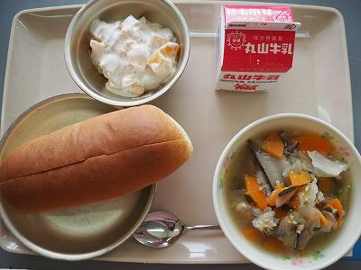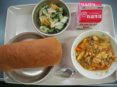 【いもっこパン・牛乳・豆腐のチリソース・セサミサラダ】