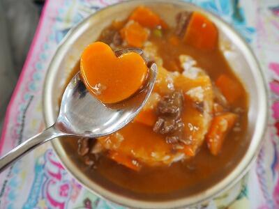 ハヤシライスの中には、ハートや星、お花の形をした人参がいくつか入っていました。これは、給食室の先生方が子どもたちに喜んでもらえるよう始めてくださった取り組みです。