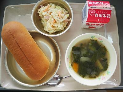 今日の給食は、滋賀県のパン屋さんで有名な「サラダパン」です。サラダパンとは、今から60年ほど前に、マヨネーズを使った総菜パンを作る時に思いついたのが始まりだそうです。サラダパンという名前のとおり、初めはキャベツとマヨネーズを和えたものでしたが、時間が経つと水分が出ることや保存がきかないことから、「たくあん」に変更されたようです。給食では、たくあんとマヨネーズだけでなく、ハムや人参、キャベツも入れて栄養価も考慮しています。