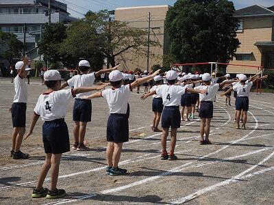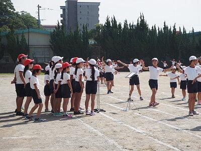 こちらは、運動会の全体練習の様子です。今日は、開会式、エール交換、ばんば踊り、3年徒走、4年学年リレーなどの練習を行い、各係の動きの確認も行いました。