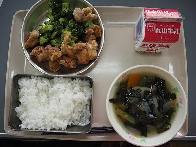 今日は、みんな大好き「とり肉の唐揚げ」です。給食室からのいいにおいが学校中に広がり、子どもたちも職員もみんなお昼の時間を楽しみにしていました。