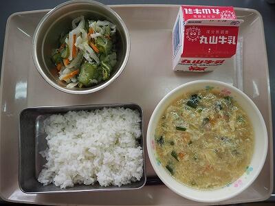 今日は、卵たっぷり親子丼です。1年生教室では、親子丼が大好評で、「親子丼がおいしいです!」「また親子丼が食べたいです!」「おいしい給食ありがとうございます!」とうれしい感想がたくさんでした。親子丼だけでなく野菜も上手に食べて今日は時間内に食べ終わる子どもたちがほとんどでした。
