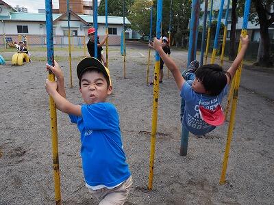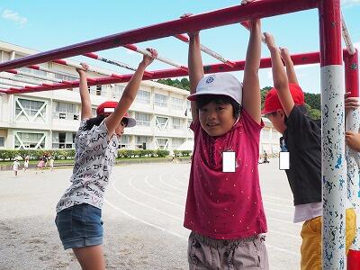 昼休みの様子です。今日も外では、たくさんの子どもたちが元気いっぱい遊んでいます。うんていをしている子も多いですね。