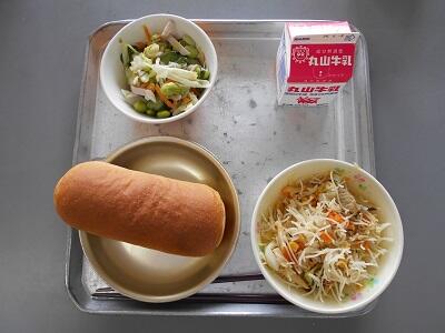今日の献立は、「牛乳」「黒糖パン」「鶏肉と野菜のレモン和え」「ラビオリスープ」でした。