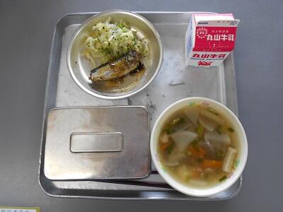 今日の献立は、「牛乳」「ご飯」「鰯の生姜煮・かりかり和え」「はちはい汁」でした。
