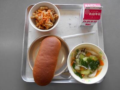 今日の献立は、「牛乳」「黒糖パン」「鶏肉と野菜のレモン和え」「ラビオリスープ」でした。