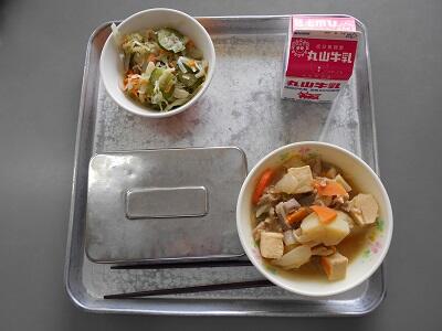 今日の献立は、「牛乳」「ご飯」「おかか和え」「いりどり」でした。