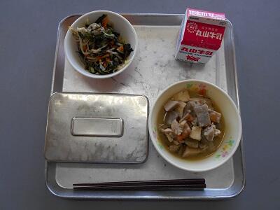 今日の献立は、「牛乳」「ご飯」「鰯の生姜煮・かりかり和え」「はちはい汁」でした。