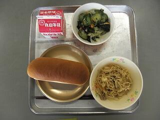 今日の献立は、「牛乳」「減量コッペパン」「塩やきそば」「海藻サラダ」でした。