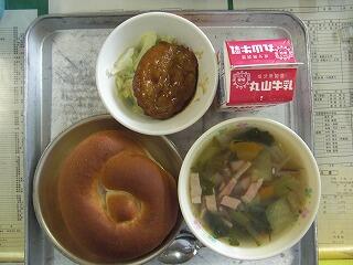 今日の献立は、牛乳、照り焼きチキンバーガー、ボイルキャベツ、野菜スープでした。