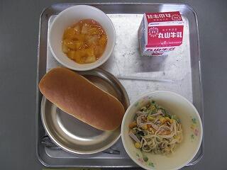 今日の献立は、減量コッペパン、牛乳、冷やし中華、フルーツクラッシュでした。