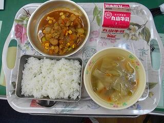 今日の献立は、ご飯、牛乳、メキシカンライス、春野菜のスープでした。