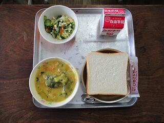 今日の献立は、食パン、牛乳、かぼちゃのシチュー、チーズサラダ、ジャムです。