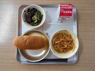 今日の献立は、減量コッペパン、牛乳、じゃーじゃー麺、海藻サラダです。
