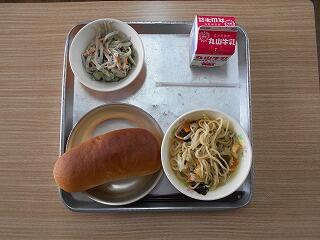 今日の献立は、減量コッペパン、牛乳、いそちゃんぽん、ごぼうのマヨネーズサラダです。