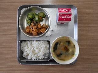 今日の献立は、ご飯、牛乳、みそ汁、カンパチの塩から揚げ、きゅうりの昆布和えです。