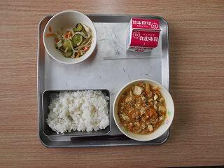 今日の献立は、牛乳、ご飯、マーボーどうふ、いかともやしのナムルです。