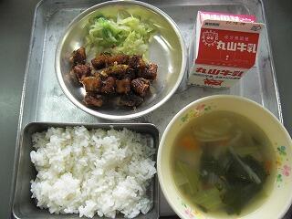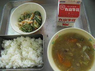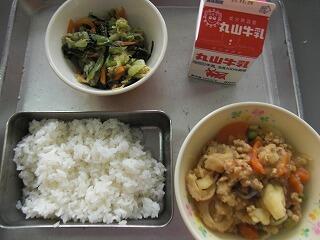 今日の給食は、牛乳、ごはん、じゃがいものそぼろに、ごまあえ、です。