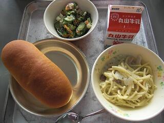 今日の給食は、牛乳、パン、豆乳のクリームスパゲティ、つぼみふっくらサラダです。