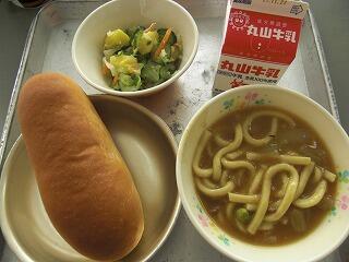 今日の給食は、牛乳、パン、カレーうどん、パインサラダです。