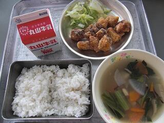 今日の給食は、牛乳、ごはん、マダイのからあげ、そえやさい、よしのじるです。