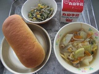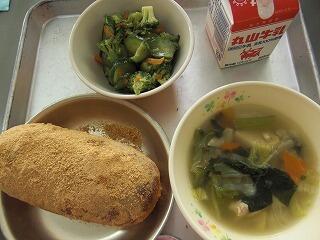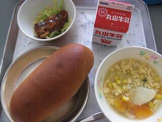今日の給食は、牛乳、こくとうパン、いわしのトマトに、そえやさい、ふわふわスープ、です。