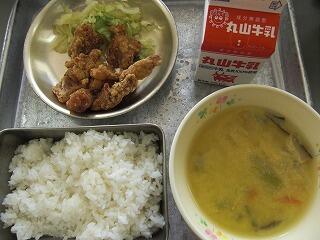今日の給食は、牛乳、ごはん、とりのからあげ、そえやさい、とうにゅうみそしる、です。