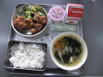 小学校は明日が卒業式。6年生にとって、小学校で食べる給食は、今日が最後になります。1年生から5年生の皆さんにとっても今の学級で食べる給食は、今日が最後になります。今日は、岡富小学校6年生からのリクエストメニューです。岡富小学校6年生に、人気ナンバー3は「たこ焼き風」ナンバー2は「カレーライス」そしてナンバー1が「鶏の唐揚げ」でした。汁物には、卒業をお祝いしたい気持ちを込めて、「祝い」の字のかまぼこを入れています。これまで給食では、できるだけ宮崎県産の肉や魚、野菜をとりれてきました。私たちのふるさと延岡では、美味しい肉や魚、野菜がたくさんとれることが、給食を通して伝えることができたかなあと思います。岡富小学校6年生のみなさん、リクエストありがとうございました。