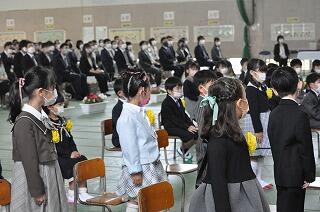 1年生は、少し緊張しながらもしっかり校長先生の目を見て話を聞いていました。