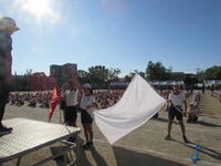 高学年部表現:統制のとれたフラッグ!力強い組体操!『たのもしい~』