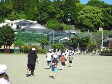 緊急地震速報が発令されたときの1次避難(机の下にもぐり、身を守る体勢をつくる)、運動場に集合する2次避難、市営岡富団地にまで移動する3次避難まで行いました。子どもたちは事前に教えてもらっていたとおりに真剣に、迅速に行動することができていました。