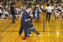 質問タイムの最後に、6年生児童と相撲をとりました。何度ぶつかってもびくともせずに笑顔で受け止めていただきました。