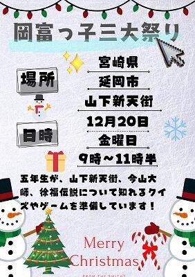 12月20日(金)、山下新天街において、本校5年生が「岡富っ子三大祭り」を行いました。この祭りは、地域の財(たから)である今山の寺社、山下新天街、徐福伝説について知り、そのすばらしさを楽しく広げようというコンセプトです。総合的な学習の時間を使い、1学期から準備を進めてきました。
