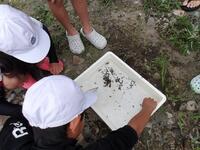体育館で説明を受けた後に、旧おぐら大瀬店下の河川敷まで徒歩で出発。そこでは、川の音、匂い、透明度などをテストしました。そして実際に水辺に入り、石をひっくりかえしたり、網ですくったりしながら生き物を捕まえ調査しました。その結果、大瀬川の水はとてもきれいであることがわかりました。街の真ん中を流れる美しい河川があることは延岡の誇りです。ふるさとを、自然を大切にする気持ちが高まった4年生でした!