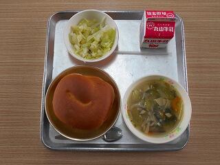 今日の献立は、牛乳、てりやきチキンバーガー、ボイルキャベツ、野菜スープでした。
