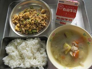 今日は、三色どんです。卵の黄色、鶏のひき肉の茶色、青豆の緑の三色です。卵は、体をつくるもとになるたんぱく質たっぷりの食品です。たんぱく質だけでなく、血液をつくる鉄分も含んでいます。色がきれいで、栄養たっぷりの食品ですよ。汁物は、豆腐、さつまいも、にんじん、だいこん、ごぼう、ねぎなどぐだくさんのさつまじるです。野菜もしっかり食べましょうね。