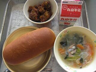 今日の給食は、牛乳、パン、たこ焼き風、はるさめスープです。