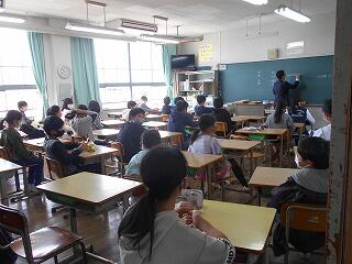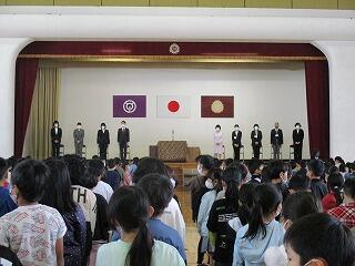 その先生方に、6年生代表児童2名が岡富小学校の歴史や特色をまじえながら歓迎の言葉を伝えました。6年生らしく、しっかり伝えることができました。