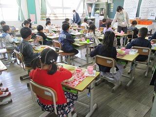 しっかり手洗いをして、給食の準備をします。今日のメニューは子ども達の大好きなカレーでした。1年生は、6年生が配膳してくれる給食をきちんと座って待つことができました。