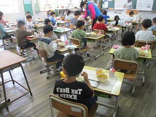 担任の先生に牛乳パックの開け方、ご飯の盛り付けかたなどを習い、みんな目を輝かせ、パクパクと食べている様子でした。