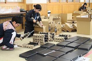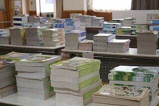 学校では、新学期に備えて、教科書が山積みになって、子どもたちへ配られるのを待っています。
