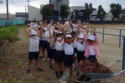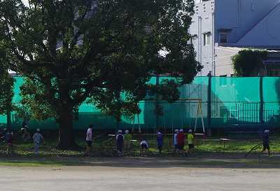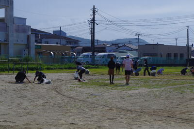 運動会や運動会練習に向けて、職員全員で、運動場の除草作業を行いました。(あち~かったです)