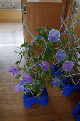 1年生が1学期から育てているアサガオ、まだ花が咲いているものもありました。