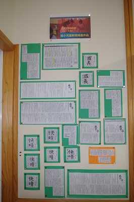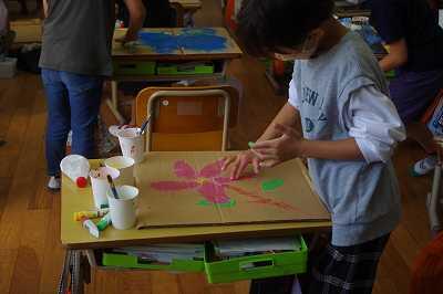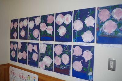 廊下には、1年生がアサガオの汁で紙を染めてつくったアサガオの花もきれいに咲いていて、みんなの心を和ませてくれています。
