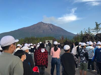 22日は桜島有村溶岩展望所で記念写真を撮ったあと、再びフェリーで鹿児島水族館に。その後班別自主研修でそれぞれ市内を回りました。