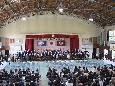新型コロナウイルス感染拡大防止のため臨時休業が続く中、卒業生と保護者、職員で卒業式を行いました。当初の予定より少ない人数の式になりましたが、在校生のメッセージや来賓の方々の思いを校長先生が式辞で述べられたので、多くの人が卒業を祝っていると実感できる式となりました。会場の見事な花々が、文字通り卒業に花を添えてくれました。