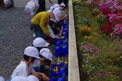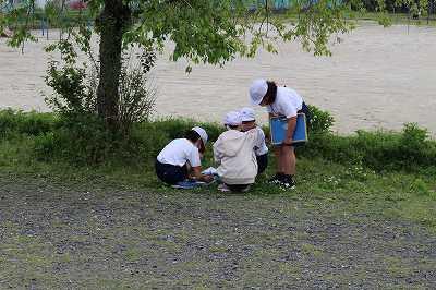 令和4年7月12日(火)、1年生がアサガオの花をつんでビニール袋に・・。色水づくりに使うようです。アリさんが巻き込まれないようにちゃんと逃がしてやっていました。