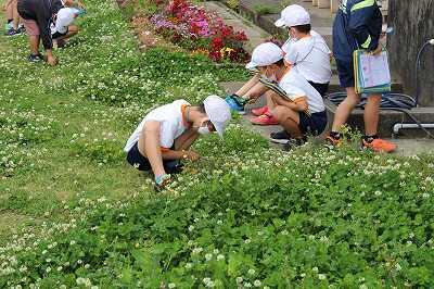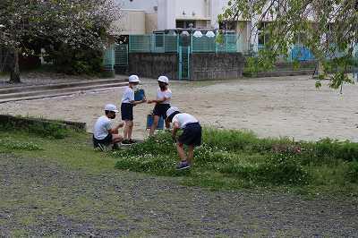 途中、ツバメの巣を見つけたり、花をつんだりしながら、学校のまわりの自然を十分に楽しみました。また、郵便局や鉄道線路の跡を見て、地域の様子もしっかり勉強することができました。