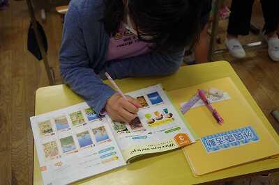 「のびっこ1」の国語は1年生の国語でした。「ねこ」と「ねっこ」の違い、つまり促音便のお勉強です。視覚的な感覚とリズムの感覚を合わせて習熟を図っていました。↓